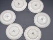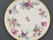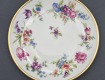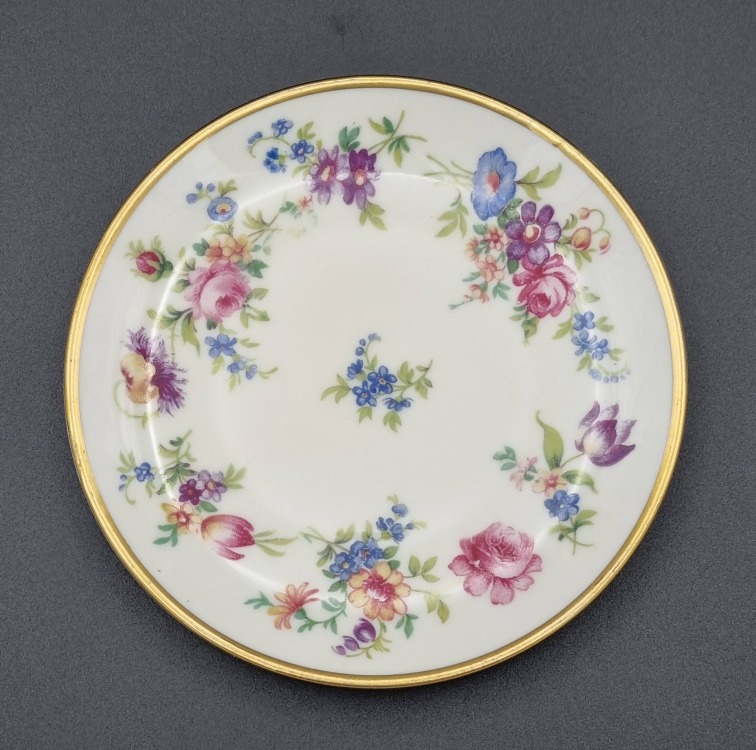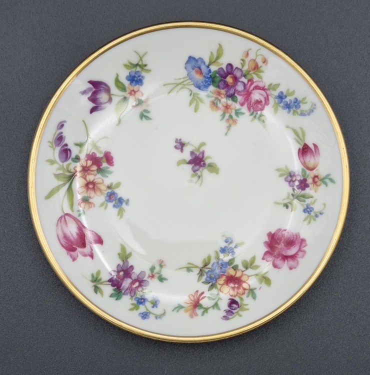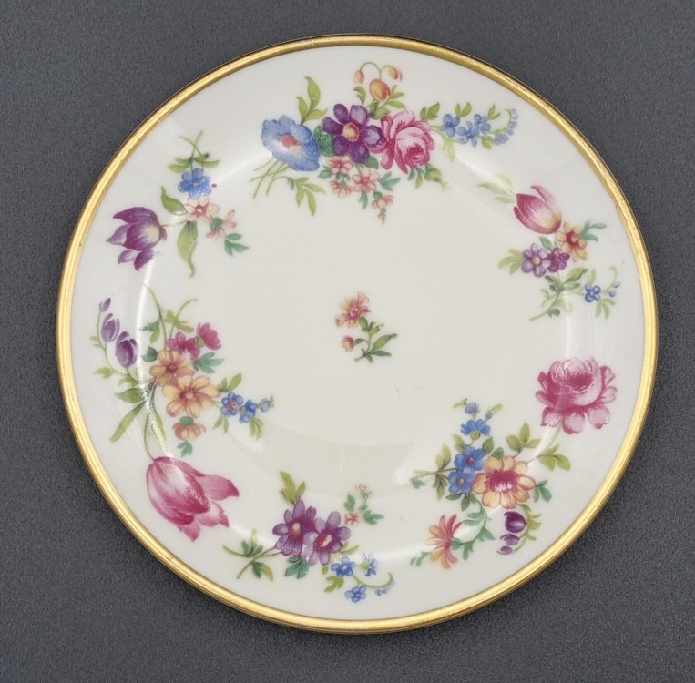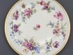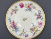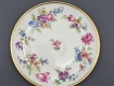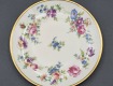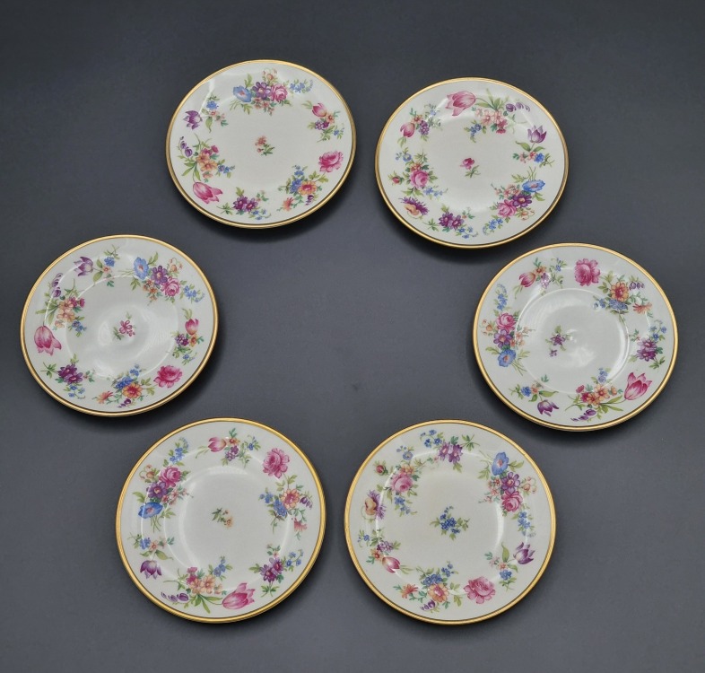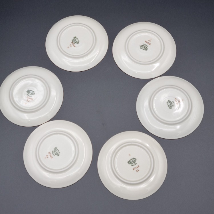 Porcelana ecru, każdy talerzyk jest zdobiony innym kwiatem.