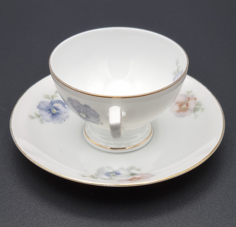 Mokka lata 20 - te XX w, sygnowana Thomas Bavaria, wykonana z białej porcelany, dekorowana motywem bratków, złocona.